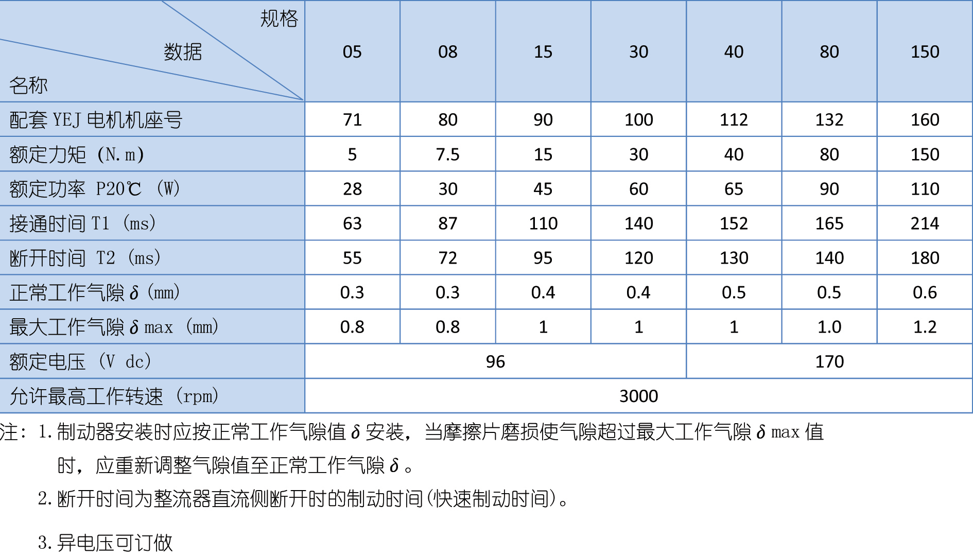 当电磁制动器的励磁线圈连接到额定电压(DC)时,电磁力吸引电枢,使电枢与制动盘分离(释放)。此时,传动轴工作正常或从制动盘启动。当驱动系统分离或断电时,制动器也断电。此时,弹簧向电枢施加压力,迫使制动盘、电枢和法兰之间的摩擦扭矩使传动轴快速停止。当制动器散热环境差,传动轴长时间连续工作时,如果条件允许,为减少发热,可在制动器工作后维持电压,并转换为额定电压的70%-80%。